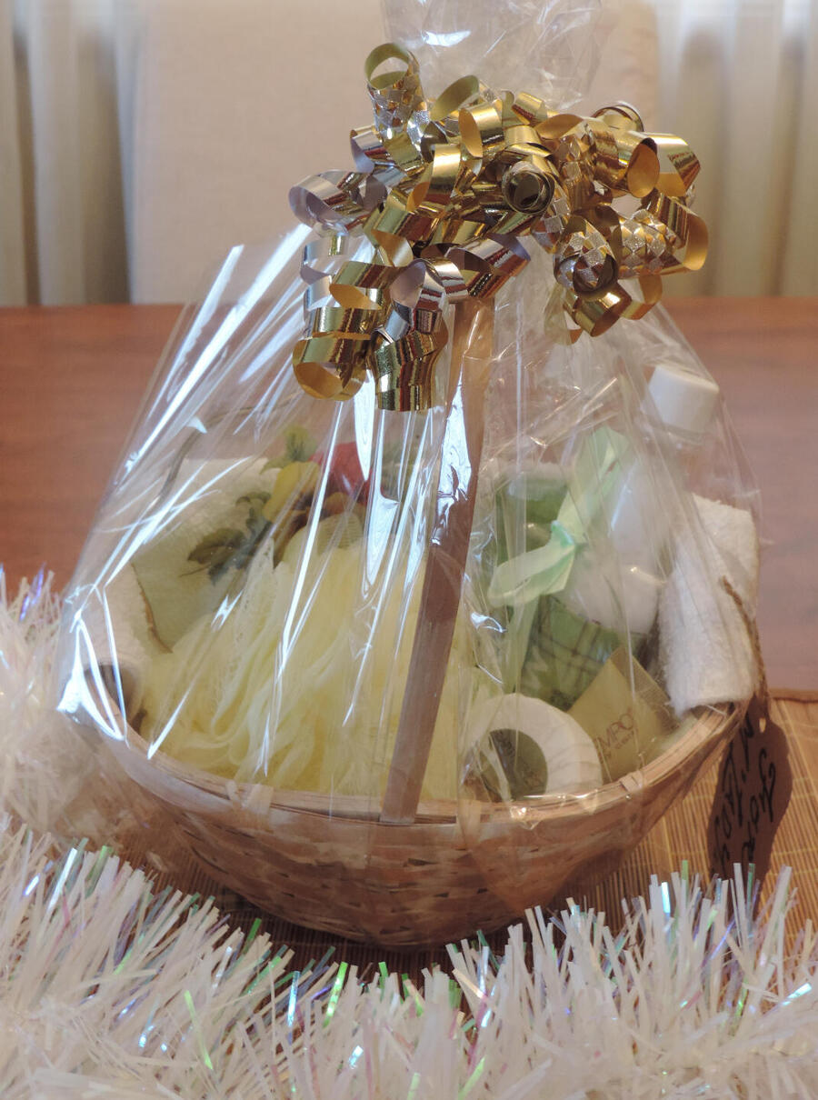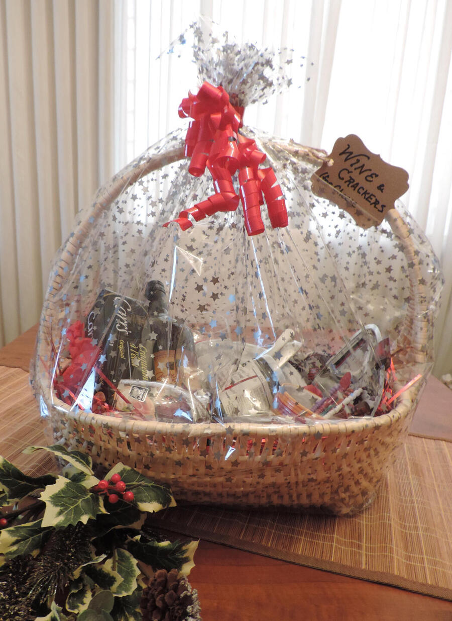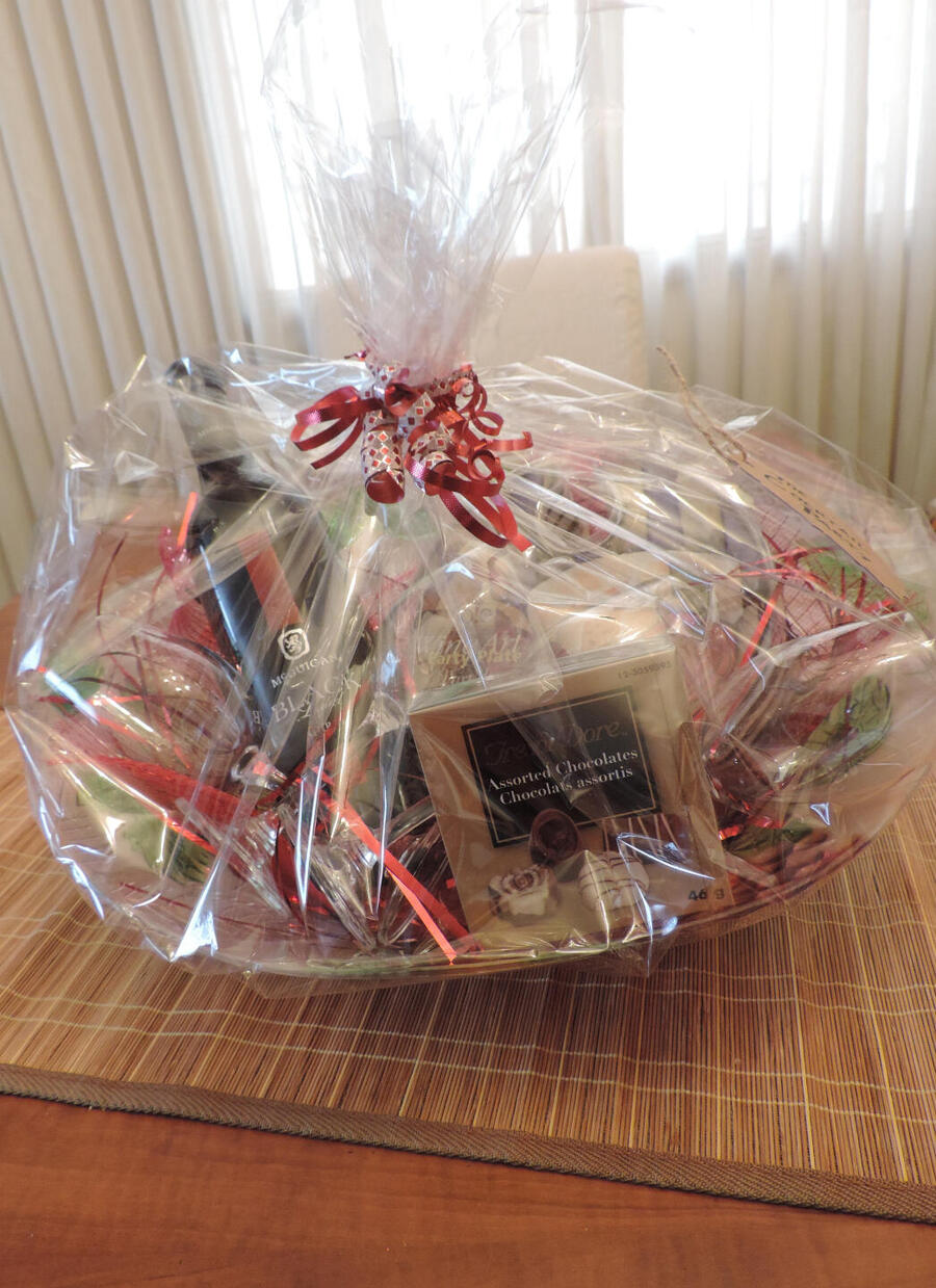 I will then custom make the basket for you using both,items I have on hand (I keep an inventory of non-perishable items -cups, glasses, mugs, partyplates, some cosmetics, grooming items etc.), everything else (coffees, teas, cheese, crackers, fruits, chocolates, etc.) I purchase fresh. My prices reflect the cost of newly purchaseditems, my designing and arranging of the basket, the wrapping and decoration and a small (10%) profit margin. Delivery in and around Calgary is free.